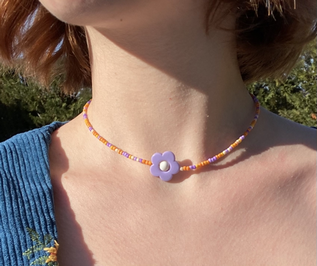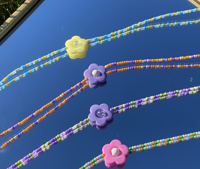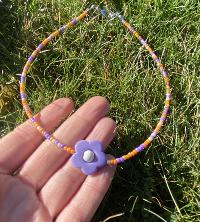 Ras-de-cou en acier inoxydable, orné de perles en rocaille de verre et d’une fleur en plastique. 💐